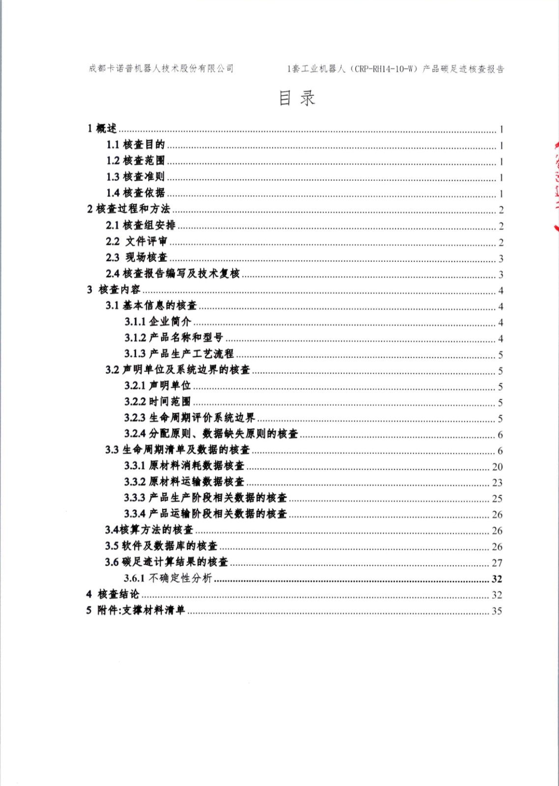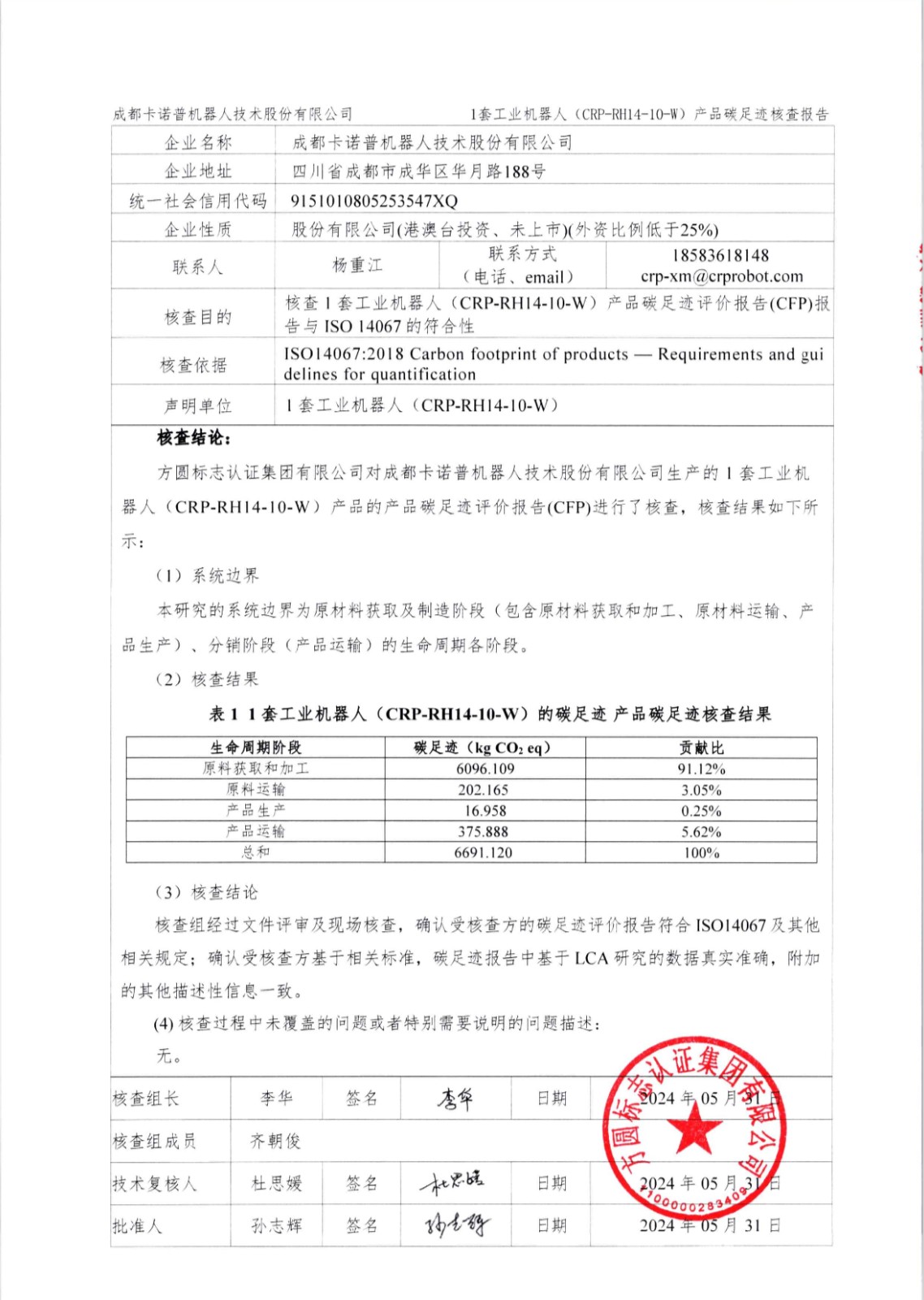 成都星空電競(jìng)機(jī)器人技術(shù)股份有限公司1套工業(yè)機(jī)器人(CRP-RH14-10-W)產(chǎn)品碳足跡第三方核查報(bào)告